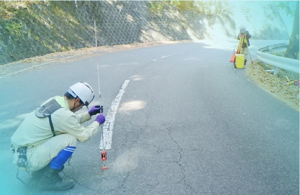 設計計画に必要な断面図を作成するため、道路・河川などの線状構造物において測量を行います。
