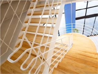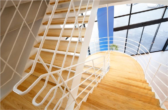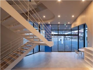 大きなガラスから自然光が差し込む、明るく広々としたエントランスです。吹き抜けの空間に伸びる白い階段が開放的です。