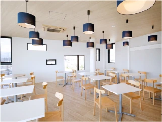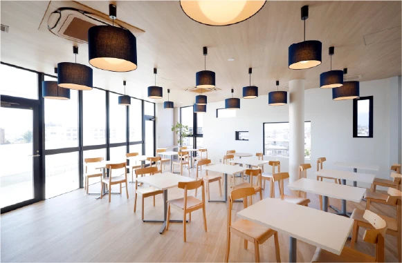 窓の外に広がる富士を眺めながら、ゆったりと過ごせる食堂です。穏やかな雰囲気の中でリフレッシュできます。
